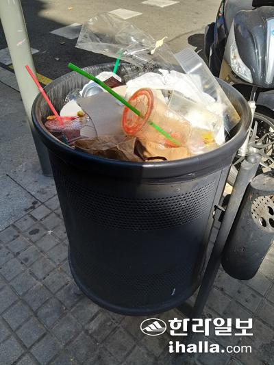 람블라 거리에 비치된 쓰레기통. 관광객들이 버리고 간 쓰레기로 가득 차 있다.