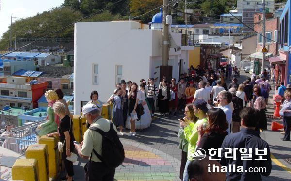 부산감천문화마을을 찾은 관광객들이 '어린왕자와 사막여우' 작품을 배경으로 사진을 찍기 위해 줄지어 기다리고 있다.