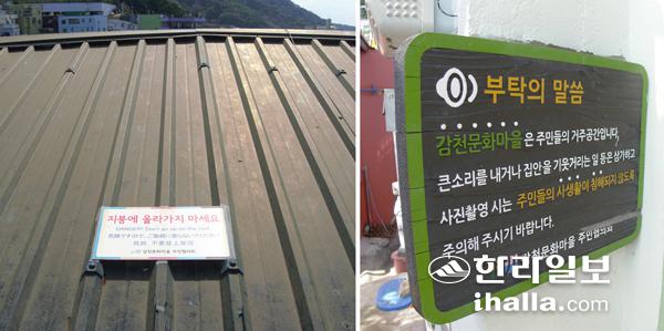 현재 감천문화마을 입구에는 방문객이 지켜야 할 10가지 에티켓을 적은 게시판이 설치돼 있다. 계단식 구조 탓에 지면보다 낮게 형성된 지붕에는 '올라가지 말라'는 경고 스티커가 붙여져 있었다. '주민 생활공간에 들어가지 말 것' '금연' '쓰레기 투기 금지' 등의 문구가 적힌 스티커도 마을 곳곳에 붙여져 있다.