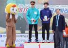 2019제주감귤국제마라톤 남자 풀코스 시상식. 왼쪽에서 두번째가 2위를 차지한 후지모리, 다음은 1위에 오른 마성민 선수.