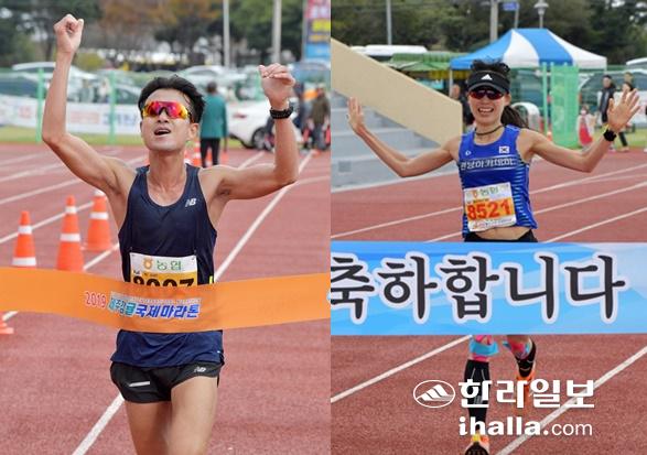 2019제주감귤국제마라톤 남여부 풀코스 1위를 차지한 마성민선수와 홍서린(오른쪽)이 골인하고 있다. 강희만기자
