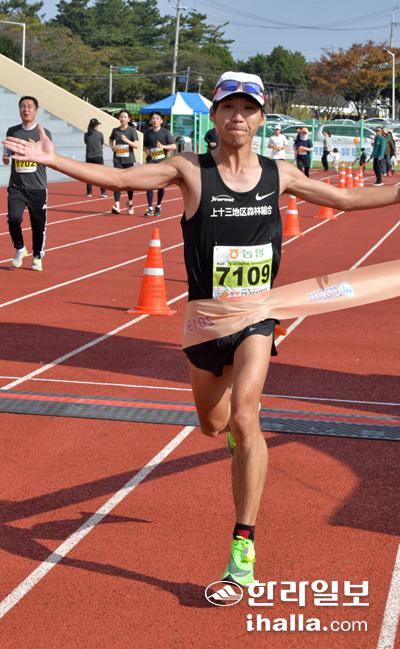 10일 감귤마라톤 하프코스에서 1시간12분35초의 기록으로 우승한 이날 무카이노 마사카즈 선수는 평탄한 코스와 청명한 날씨가 좋은 기록을 낼 수 있었던 가장 큰 요인이라고 꼽았다.