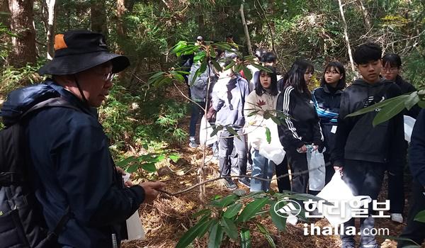 오름중 학생들이 16일 한라산둘레길에서 열린 '제주도교육청과 한라일보가 함께하는 숲학교'를 찾아 유익한 시간을 보냈다.