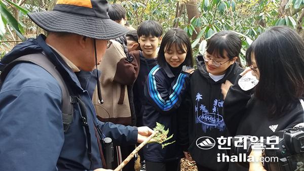 오름중학교 학생들이 16일 한라산둘레길에서 멧돼지가 먹이활동을 한 모습에 대해 김완병 박사의 이야기를 경청하고 있다.