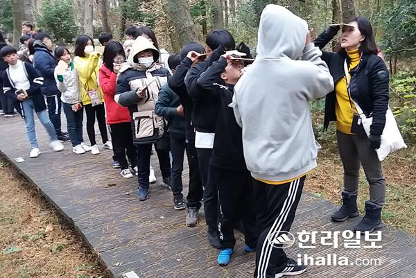 한마음초 어린이들이 19일 붉은오름 자연휴양림 숲길에서 하늘경으로 자연을 바라보고 있다.
