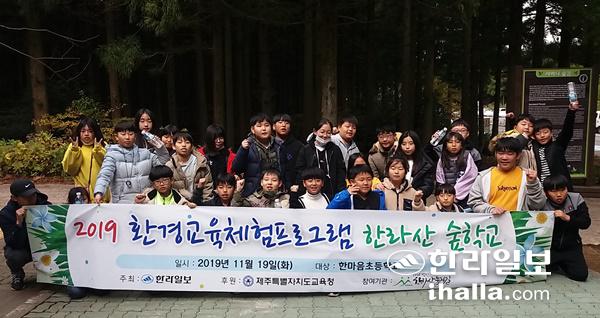 한마음초 어린이들이 19일 제주의 명품숲 사려니숲길 앞에서 기념촬영을 하고 있다.