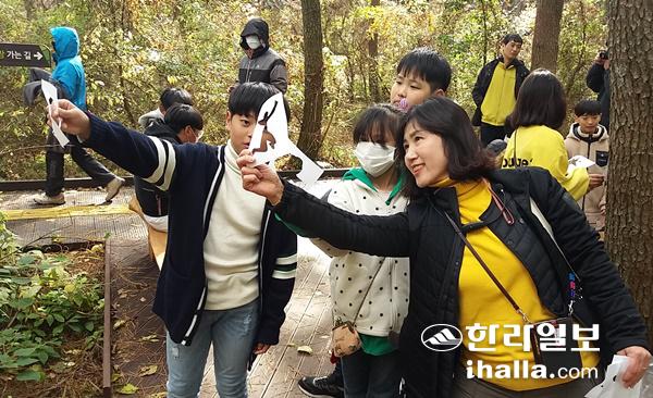 한마음초등학교 5학년 어린이 28명이 '제주도교육청·한라일보가 함께하는 숲학교'의 다섯번째 손님으로 19일 제주의 명품숲 붉은오름 자연휴양림에 초대됐다. 김형철 교감을 비롯해 고영혜 교무부장, 양영훈·강은지 교사가 이날 아이들과 숲나들이에 동행했다.
