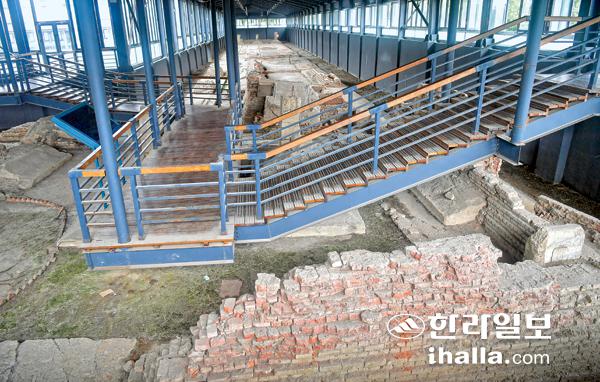 전시관 내부. 당시 건물터를 노출시켜 관람토록 하고 있다. 강희만기자