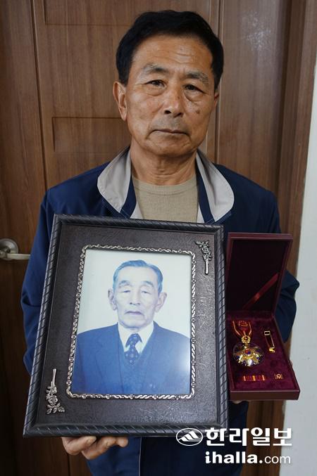 1일 김민보씨가 그의 부친 고(故) 김두성(金斗性) 선생의 사진과 지난달 17일 추서 받은 건국훈장 애족장을 들고 있다. 김현석기자