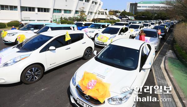 이벤트 참여를 위해 제주종합경기장 광장에 대기중인 전기자동차. 한라일보DB