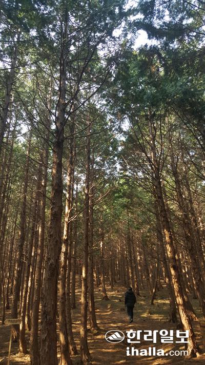 사유지인 고이오름에는 40년생 편백나무 7만그루가 군락을 이뤄 하늘을 찌를듯 자라고 있다.