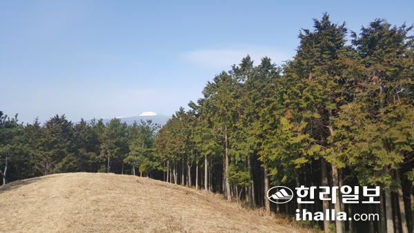 고이오름 정상에서 북쪽으로 눈쌓인 한라산이 보인다. 사진=문미숙기자