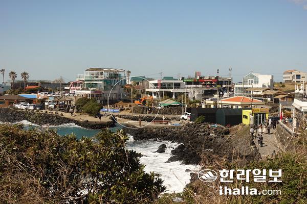 바다와 이웃한 제주시 애월읍 한담마을 전경. 굴삭기가 보이는 곳(원 안)이 초가 신축 공사가 진행중인 장한철 생가 터다. 진선희기자