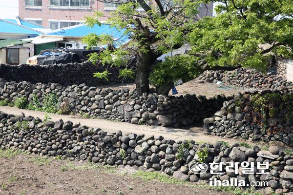 아름다운 돌담 경관을 낳은 둥근 바당돌이 알작지 바다 개발로 사라지고 있다. 사진은 내도동 마을의 돌담.