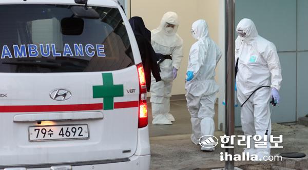 코로나19 확진자가 제주대학교병원으로 이송되고 있다. /사진=한라일보DB