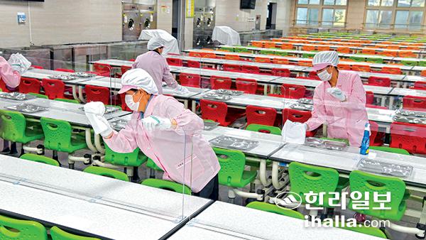 급식소 식탁에 설치된 칸막이. 사진=한라일보DB