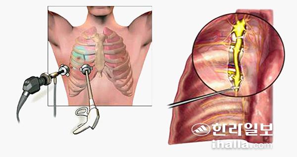 수술적 치료에는 가슴 부위에 작은 구멍을 내고 내시경으로 수술하는 흉강 내시경 교감신경 절단술이 있다. 영구적인 효과가 있는 이 수술법은 주로 손과 겨드랑이 등의 국소적 다한증 치료에만 사용한다. 수술 시간은 1시간 정도로 당일 퇴원이 가능하다. 얼굴과 손, 겨드랑이 부위의 다한증에 대한 교감신경수술의 성공률은 95% 이상으로 비수술적 치료방법들에 비해 매우 좋은 성적을 보이고 있다. 교감신경 절단술은 부작용으로는 수술 과정의 전기열로 인한 신경 손상에 의해 눈꺼풀이 내려오는 '호너 증후군'이 생길 수 있으며 시술한 부분 이외에 몸의 다른 부위에서 땀이 많이 나는 보상성 다한증이란 부작용이 발생할 수 있다. 아직 보상성 다한증의 특별한 해결법이 약물치료 이외에는 없기 때문에 수술 여부는 수술 전에 수술방법, 수술결과, 수술 합병증 등에 대해 담당의사와 충분히 상담하여 신중하게 결정해야 한다. <제주대학교병원·한라일보 공동기획>