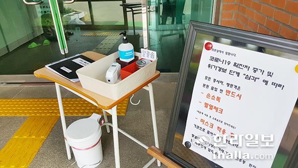 코로나19로 자원봉사자 등 외부인 출입이 금지된 도내 한 장애인복지시설 입구에 시설 종사자와 방문자의 방역지침 안내문이 나붙어 있다. 문미숙기자