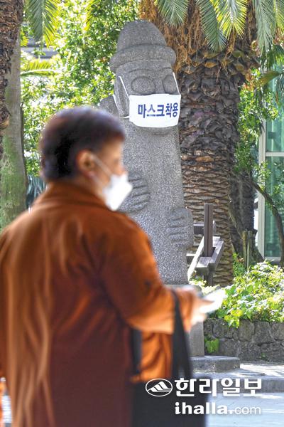 코로나19 시국에 마스크를 쓴 돌하르방 앞을 지나는 관광객. 한라일보DB