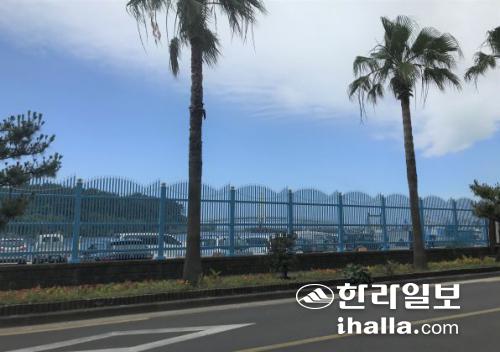 서귀포항 약 300m 구간에 설치된 철제 울타리. 그 너머에 새섬과 새연교가 있다. 김도영기자