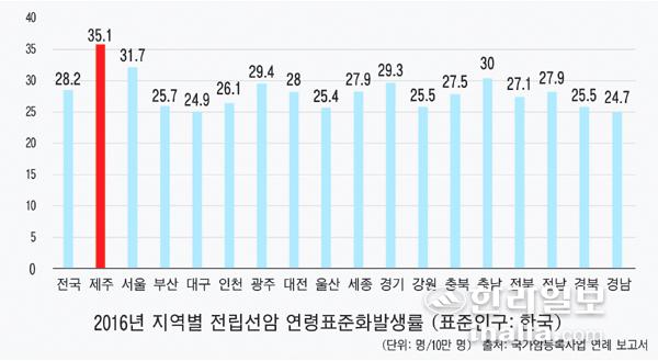 제주도는 우리나라에서도 유독 전립선암 발생률이 높다. 보건복지부가 매년 발간하는 국가암등록통계 보고서에 따르면 제주도의 전립선암 발생률(연령표준화발생률)은 10만 명 당 35.1명으로 전국 지자체 중 가장 많았고, 평균인 28.2명과 대비해서도 24% 높은 수치를 보였다.