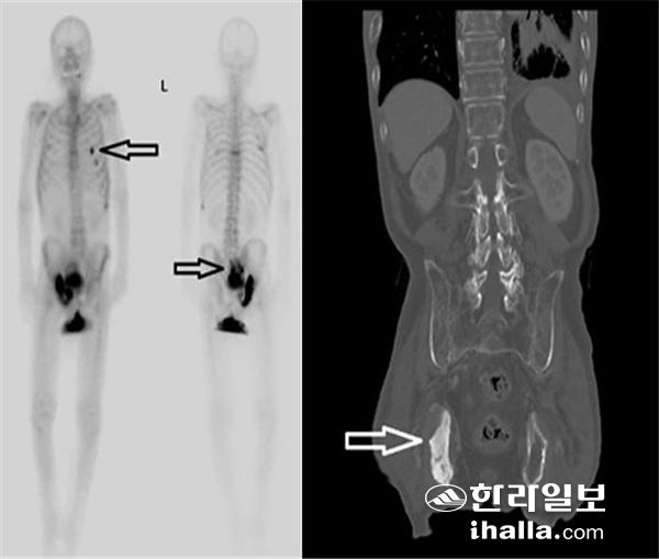 4기 전립선암 환자의 삶의 질을 위협하는 치명적인 합병증 중 하나는 뼈 관련 질환이다. 병적 골절, 척수압박 등을 통틀어 '뼈전이 합병증'이라고 한다. 사진은 뼈전이 전립선암 환자 사례. 제주대학교병원 제공
