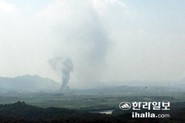 북한이 16일 오후 2시49분 개성 공동연락사무소 청사를 폭파한 것으로 알려진 가운데 개성공단에서 검은 연기가 피어 오르고 있다. 연합뉴스