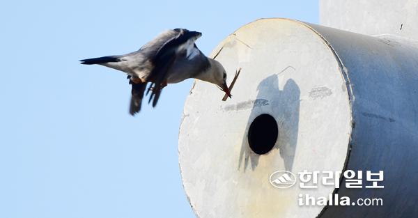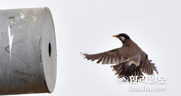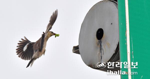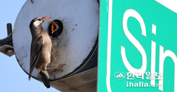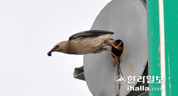 최근 제주의 환경변화와 번식지 부족으로 도내 주요 도로표지판 구멍에 찌르레기들이 번식하는 모습이 자주 관찰되고 있다. 찌르레기들은 나무 구멍에 둥지를 틀어 번식하는 새로 알려져 있지만 제주에서 둥지로 쓸 나무 부족으로 도로이정표를 이용하고 있다. 강희만기자