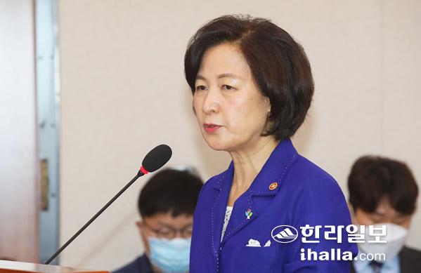 추미애 법무부 장관이 18일 국회 법제사법위원회 전체회의에서 업무 보고하고 있다. 연합뉴스
