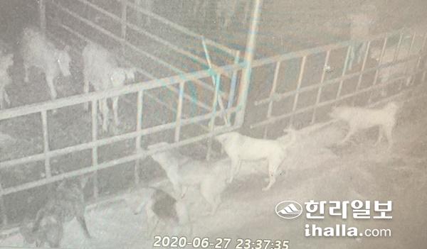 지난 27일 밤 제주시 한림읍 한 농가 축사에 들개가 습격해 송아지를 위협하는 장면이 폐쇄회로(CC) TV에 잡혔다. 송아지 4마리가 들개에 의해 폐사했다.연합뉴스