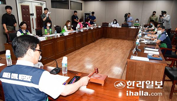 이어 심의안건 문제는 이날 산업안전보건위원회 진행 과정에서 노동자 위원들이 항의하자 그제서야 심의안건으로 등록했다. 앞서 지난 24일 제주도의회 예산결산특별위원회에서 출석한 강순문 실장은 "산업안전보건위원회에서 감량기 안전사고와 폭염 대책 등을 안건으로 다루겠다"고 밝힌 바 있다.