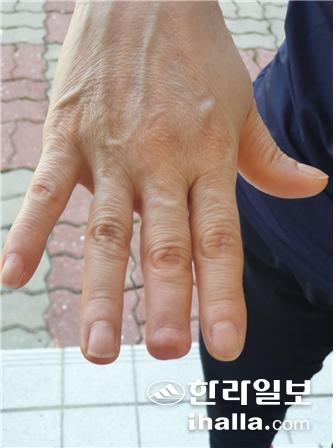 2018년 제주도내 한 학교 급식소에서 음식물쓰레기감량기에 의해 손가락이 절단된 노동자의 손. 하지만 제주도교육청은 여태껏 이 사고를 베임사고로 인지하고 있었다. 사진=민주노총 공공운수노조 전국교육공무직본부 제주지부
