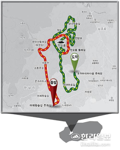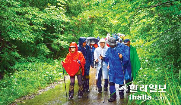 흘러내리는 물소리를 들으며 걷다 보니 어느새 민오름둘레길에 도착했다. 에코투어 일행은 둘레길 내에 평상 등이 설치된 공터에서 점심을 먹기 위해 자리를 잡았다. 일부 참가자들은 내리는 비를 피하기 위해 입고 있던 우비를 연결해 천막을 만드는 진풍경을 연출하기도 했다. 한 참가자는 "코로나19 사태 이후에 내부 활동이 아닌 자연과 함께하는 관광산업이 커질 것으로 보인다"며 "한라일보가 이번 에코투어 행사와 같이 자연과 함께할 수 있는 제주관광의 방향성을 잘 제시해달라"는 조언도 아끼지 않았다.