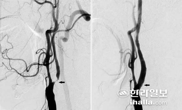 경동맥 스텐트 삽입술 후 촬영한 혈관조영술 사진. 사진의 화살표가 스텐트 삽입 부위(우).