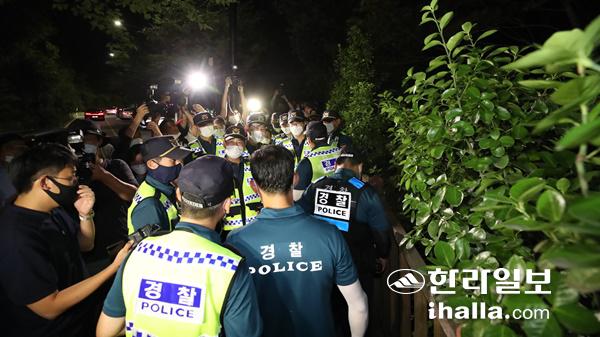 경찰에 박원순 서울시장이 실종됐다는 신고가 들어온 9일 오후 서울 종로구 와룡공원 일대에서 경찰이 야간수색을 하고 있다. 연합뉴스