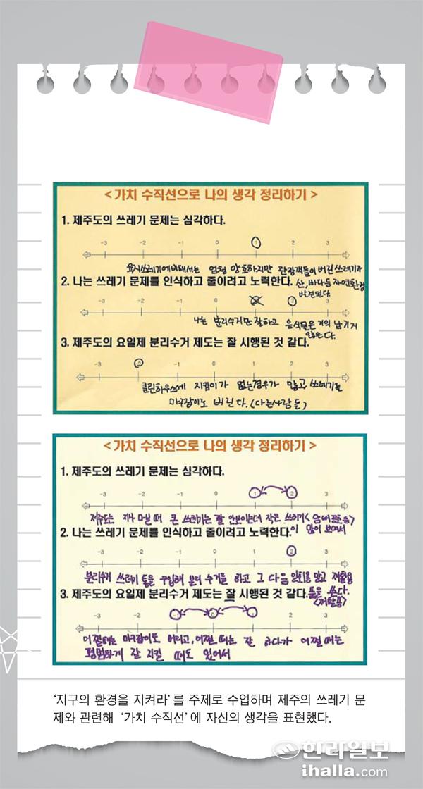 ‘지구의 환경을 지켜라'를 주제로 수업하며 제주의 쓰레기 문제와 관련해 '가치 수직선'에 자신의 생각을 표현했다.