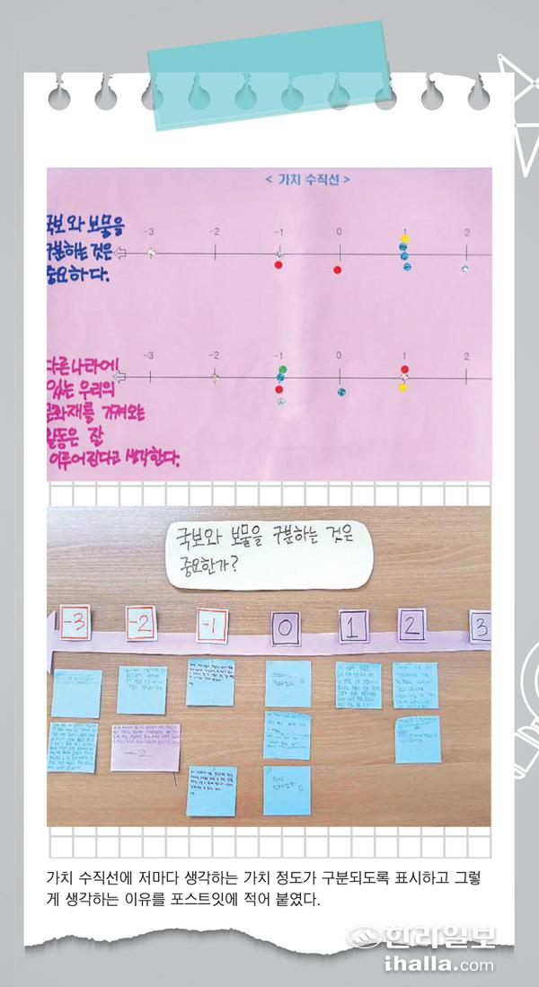 '국보와 보물을 지켜라'를 주제로 수업을 하며 '가치 수직선 토론' 활동을 했다. 국보와 보물을 이해하는 활동을 바탕으로 가치에 대해 생각해 볼 수 있는 논제를 제시한다. '국보와 보물을 구분하는 것은 중요하다'/'다른 나라에 있는 우리의 문화재를 되찾아오는 활동이 이뤄져야 한다고 생각한다' 등 주제와 연관된 가치를 생각해 볼 수 있는 질문을 던진다.
