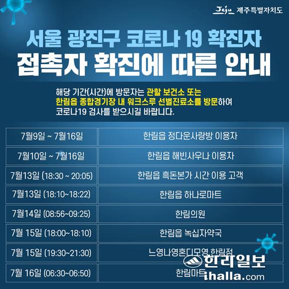 제주도 방역당국은 광진구 확진자와 관련해 지역 전파를 차단하고 신속한 검사를 지원하기 위해 한림읍에 방역전담직원을 직접 파견해 현장대책반을 운영하며 한림읍 일대 집중 방역관리를 진행 중이다.