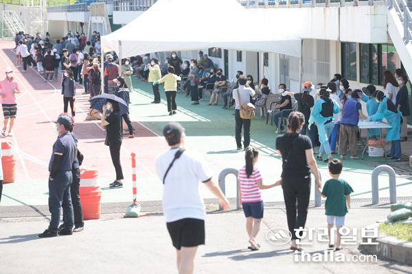 17일 오전 제주시 한림읍 체육관 운동장에 마련된 임시 진료소에서 수백명의 주민들이 코로나19 검사를 위해 대기하고 있다. 연합뉴스