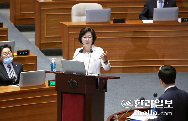 추미애 법무부 장관이 22일 국회 본회의에서 열린 정치·외교·통일·안보에 관한 대정부질문에 참석, 답변하고 있다. 연합뉴스