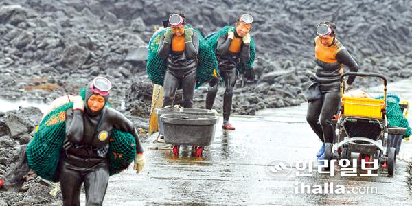 27일 제주시 한림읍 귀덕리 해안에서 해녀들이 수확물을 등에 지고 뭍으로 나오고 있다. 강희만기자