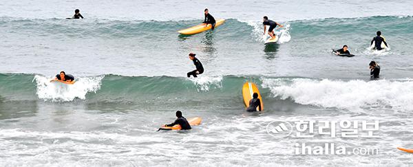 28일 서귀포시 안덕면 사계리 바다에서 서퍼들이 파도를 타며 제주의 여름을 즐기고 있다. 강희만기자