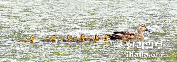 28일 서귀포시 대정읍 하모리 한 연못에서 갓 태어난 흰뺨검둥오리 가족의 나들이하는 모습이 정겨움을 안겨주고 있다. 강희만기자
