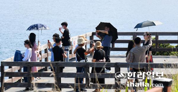 30일 제주시 용두암을 찾은 관광객들이 바다를 배경으로 기념사진을 찍고있다. 이상국기자