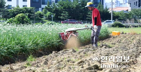 2일 제주시 애월읍 한 밭에서 농민이 무더위속에 부추를 심기위해 분주히 밭을 갈고있다. 이상국기자