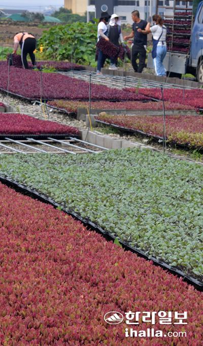1일 제주시 한림읍 수원리 한 종묘장에서 무더위속에 각종 모종들을 농가에 배달하기 위해 선적작업이 이뤄지고 있다. 강희만기자
