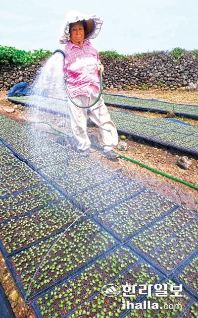 3일 제주시 한림읍 상대리에서 한 농민이 양배추 모종에 물뿌리기 작업을 하고 있다. 강희만기자