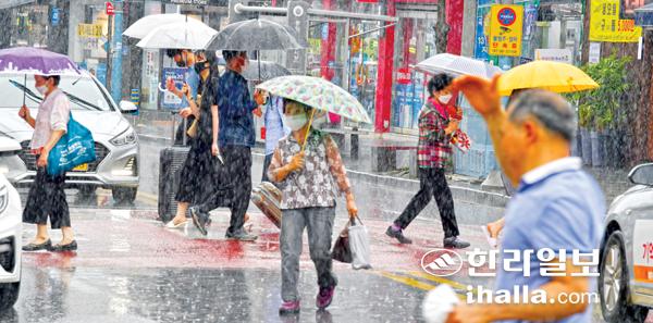 5일 제주 전역에 계속되는 무더운 날씨를 식히는 단비가 내린 가운데 제주시 중앙로 황단보도를 시민들이 우산을 쓰고 걸어가고 있다. 강희만기자