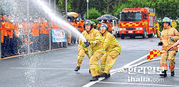 5일 제주시 아라동 제주도소방교육대에서 열린 '2020 제주도 소방기술경연대회' 속도방수 경기에 참가한 대원들이 소방호수를 통해 물을 뿜어내고 있다. 강희만기자