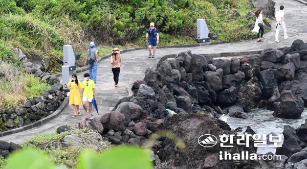 6일 제주시 애월읍을 찾은 관광객들이 바다와 인접한 한담해안산책로를 걸으며 여유를 즐기고 있다. 이상국기자